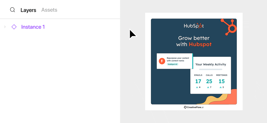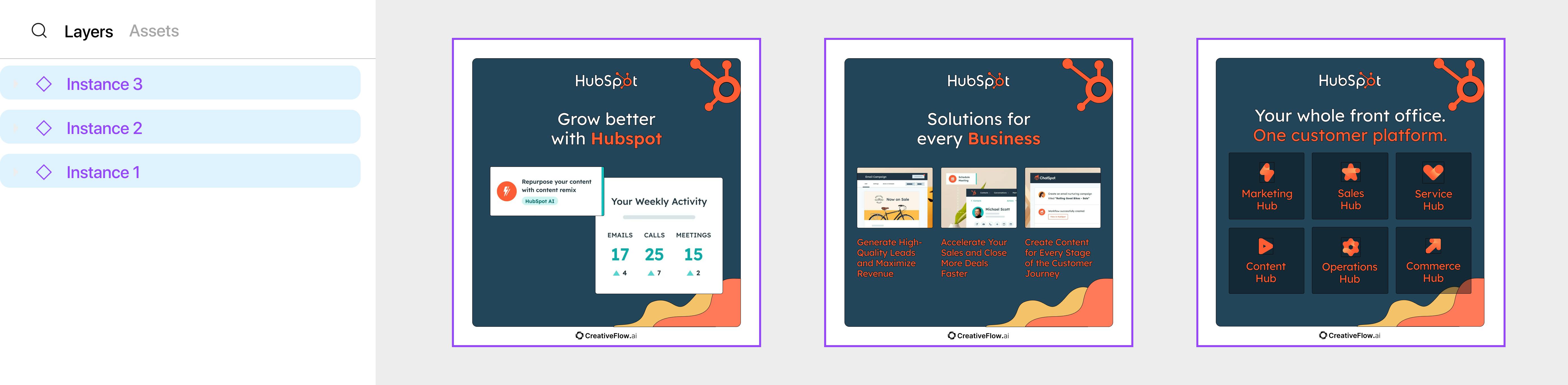 You'll see the instance icon to the left of the top-level element name in the layer panel on the left, and the elements will have a purple outline on the canvas when selected.